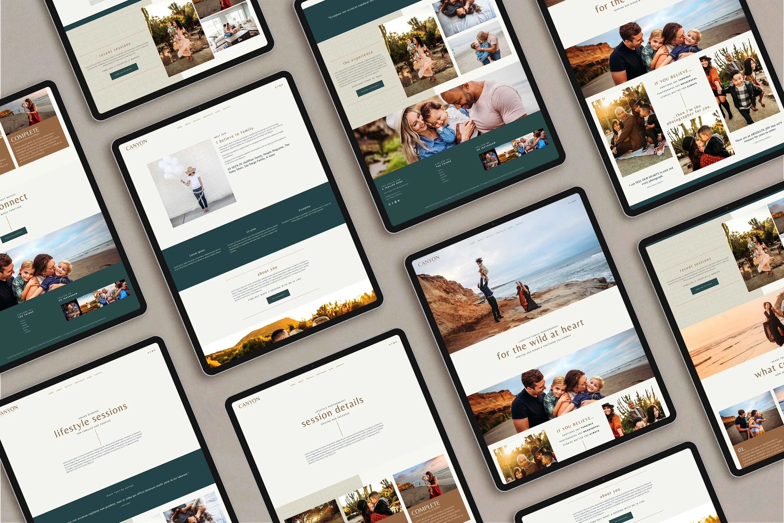 Approachable but polished AF, the CANYON template has plenty of space to showcase your photographs and works with a variety of color schemes and branding visuals. An organic call to action sequence moves visitors through your site while creating a sense of connection with them using both words and your photographs. This template is ideal for both single and multi-genre photographers (e.g., families only or families, couples, and newborns, etc).